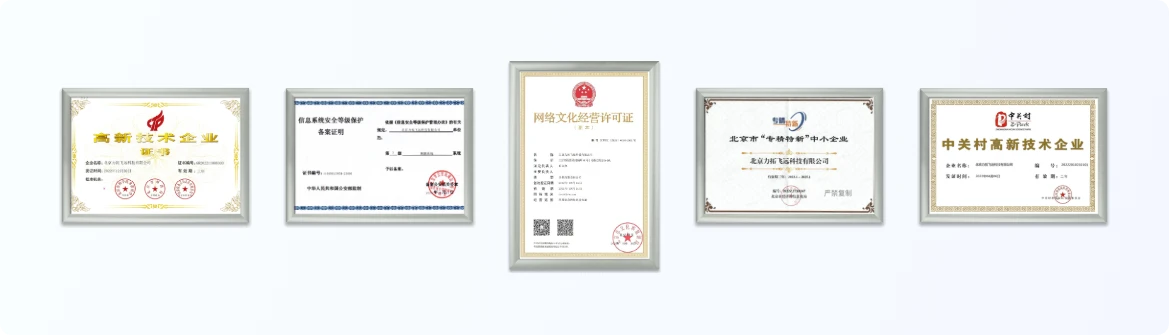 OPERATION QUALIFICATION集团旗下多家关联企业拥有国家高新技术企业认证、中关村高新技术企业认证、专精特新企业认证,拥有文网文、ICP、三级等保等合规资质